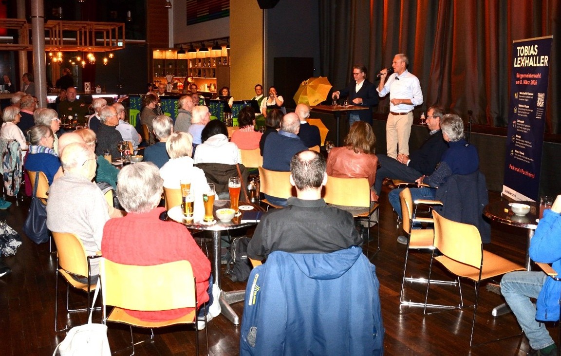 Schnell war den Anwesenden klar, dass Lexhaller ein Macher ist, jemand, der Dinge voranbringen möchte und sich nicht scheut, auch Unangenehmes anzupacken. Aber auch jemand, der zuhören kann und verbinden möchte. Die drängendsten Aufgaben sieht er in der Konsolidierung des momentan schwächelnden Stadthaushalts, im Wohnungsbau und in der Energiewende. Diese gelte es, nach der Wahl sofort anzupacken. „Im Haushalt fehlen etwa acht Millionen Euro“, führte er aus. Dies liege unter anderem an dem Wegzug einer größeren High-tec-Firma , der sich deutlich in der Kasse bemerkbar mache.