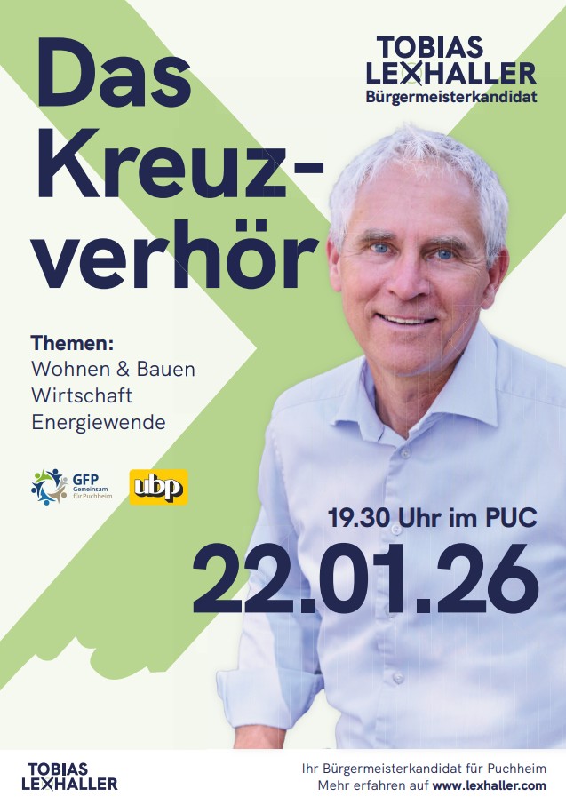 Am Donnerstag, 22.01.2026 um 19:30 Uhr findet im PUC das Kreuzverhör statt. Bürgermeisterkandidat Tobias Lexhaller stellt sich Ihren Fragen zu den Themen Wohnen und Bauen, Wirtschaft und Energiewende.