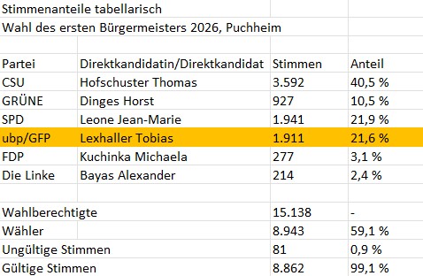 Um 30 Stimmen! Tobias Lexhaller nicht in der Stichwahl! Von wpadmin9. März 20269. März 2026Aktuell Es hat leider nicht gereicht! Die Unabhängigen Bürger Puchheim bedanken sich für Deinen hervorragenden Einsatz! Dr. Reinhold Koch